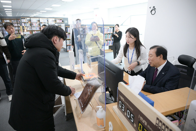 이날 최민호 시장은 소통의 시간에 앞서 도서관 4층 종합 자료실에서 1일 도서관 사서로 참여해 시민들의 도서 대출 반납 업무를 경험했다.