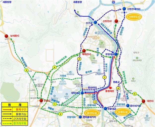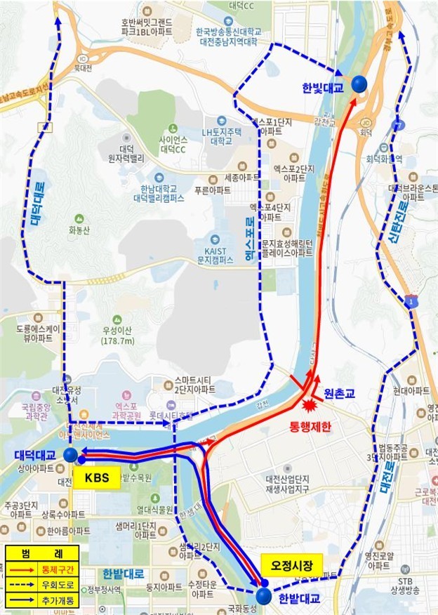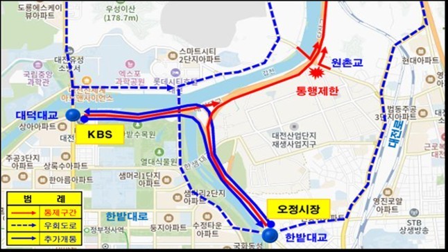 이에 앞서 4월 3일부터는 KBS 대전방송국에서 오정동 농수산물시장 구간의 양방향 통행로를 추가 개방해 우회 도로의 과부하를 분산시킨다는 계획이다.