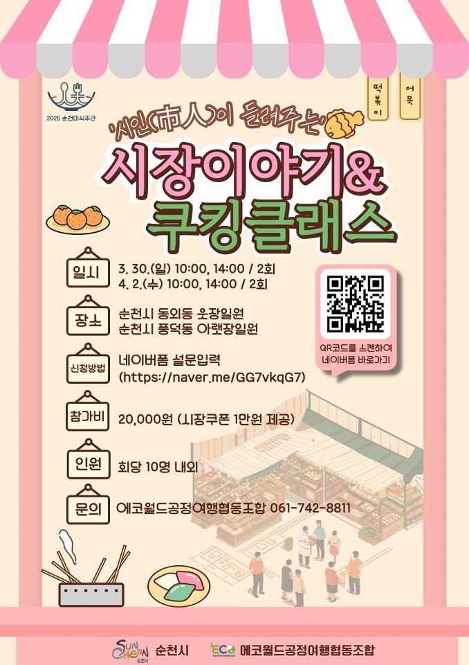 시 관계자는 “순천의 웃장과 아랫장은 역사와 전통을 가진 시장으로, 이번 투어 프로그램을 통해 전통시장의 이야기와 함께 순천의 맛을 담은 도시락을 만들며, 봄 동천의 아름다움을 즐기시길 바란다”고 말했다.