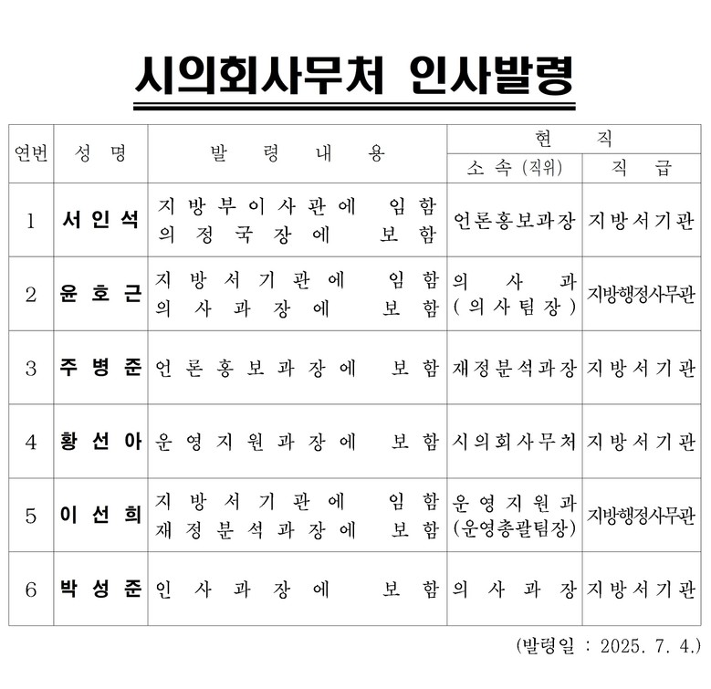 [서울 세계타임즈=이장성 기자] 서울시의회(의장 최호정)는 ’25년 하반기 시의회사무처 조직개편에 따라 신설된 3급(의정국장) 임용 및 4급 이상 간부에 대한 전보를 ’25. 7. 4.자로 시행한다고 밝혔다.