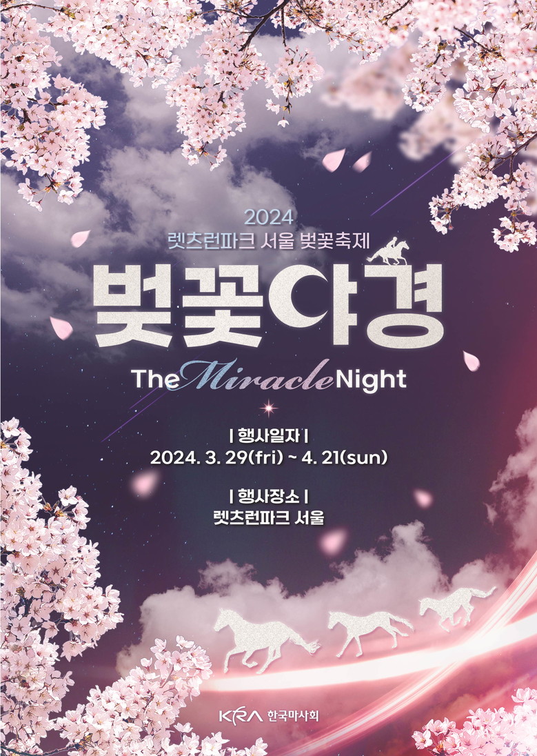 여의도, 석촌호수 등이 대표적인데 과천에 위치한 렛츠런파크 서울이 ‘한번 가본 사람은 매년 가는‘ 숨은 벚꽃명소로 이름을 알리며 약 25만 여명의 봄 손님이 다녀가고 있다. 오는 29일부터 약 한달간 「벚꽃야경-The Miracle Night」라는 테마 아래 펼쳐지는 2024년 렛츠런파크 서울 벚꽃축제는, 올해의 경우 야간경마도 함께 즐길 수 있어 봄꽃과 레저의 만남이라는 전국 유일의 이색 벚꽃 명소로 기대가 모아지고 있다.