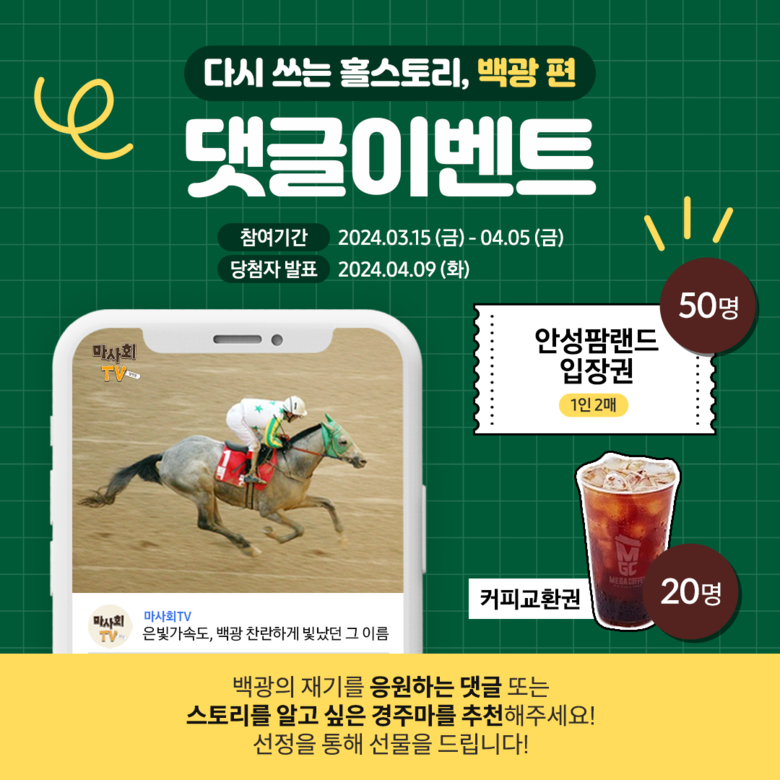 이번 이벤트에 참여하려면 마사회TV 유튜브 채널에서 백광의 스토리 영상을 시청한 후 응원댓글 또는 스토리가 궁금한 경주마 추천을 남기고, 구독 및 댓글 인증샷을 설문폼에 업로드하면 참여가 완료된다. 참여자 중 추첨을 통해 총 50명에게 백광이 곧 옮겨가게 될 보금자리인 ‘안성팜랜드’ 입장권(1인2매)을 증정한다.