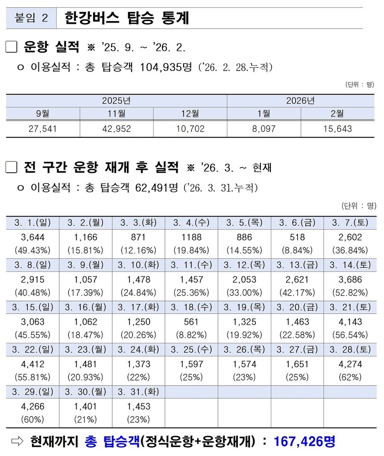 한강버스 개통 후 월간 최대 탑승, 3월 탑승객 6만명 돌파