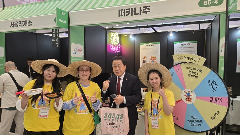 | ▲ 지난 3월 26일 동대문디자인플라자(DDP)에서 개최된 ‘2026 소상공인 힘보탬 박람회’에 참석한 김용호 서울시의원(오른쪽 두 번째)이 용산구에서 가게를 운영하고 있는 떠카나주 매장에서 제품을 구매한 후 직원들과 기념촬영을 하고 있다. |