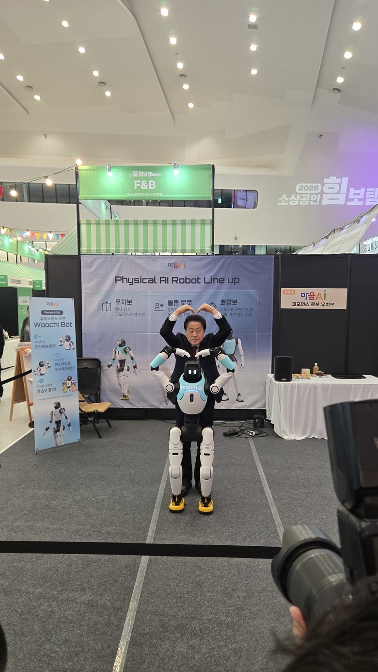 | ▲ 지난 3월 26일 동대문디자인플라자(DDP)에서 개최된 ‘2026 소상공인 힘보탬 박람회’에 참석한 김용호 서울시의원이 로봇 제작업체를 둘러보고 로봇과 같이 사랑해요를 연출하며 기념촬영을 하는 모습이다 |
