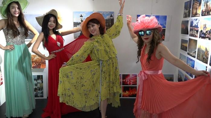 | ▲미셸 권 작가(맨 오른쪽)가 모델들과 사진작품 사이에서 드레스 치장을 하고 포즈를 취하고 있다. |