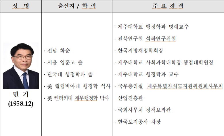 한국지방재정학회장, 총리실 제주지원위사무처 산업진흥관 등 역임 [세계타임즈 = 이채봉 기자] 신임 국무총리비서실장(차관급)에 민기(66세) 제주대학교 행정학과 명예교수가 임명됐습니다.