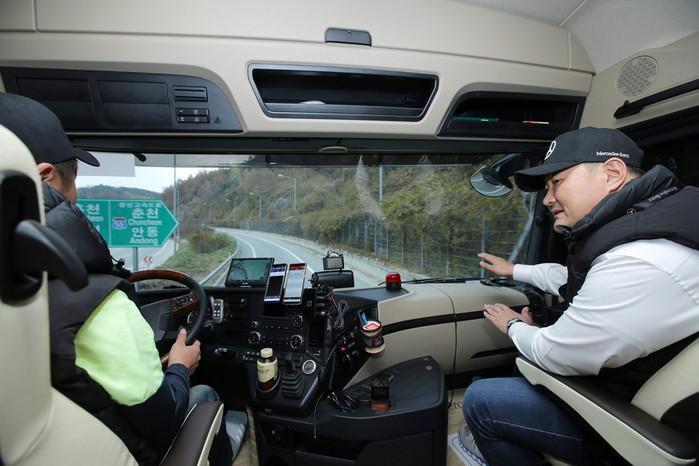 이론 교육에 이어 진행된 2교시 1:1 주행 실습 교육에서는 실제 고객들의 차량으로 다임러 트럭 코리아의 전문 트레이너가 동승하여 오크벨리 리조트에서 횡성 IC까지 오르막, 내리막길이 반복되는 고속도로와 국도로 구성된 구간을 주행하는 코스에서 각 지점의 특성과 지형에 따라 크루즈 컨트롤 및 에코롤 기능, 고성능 엔진 브레이크 및 워터 리타더 등 혁신적인 보조 제동 장치를 활용하여 주행하는 트레이닝이 진행되었다.