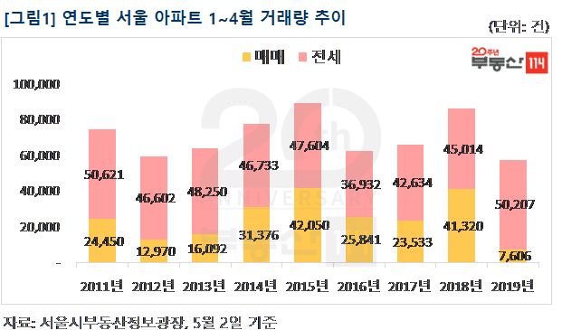 하지만 역대 최저 수준의 거래량임을 감안할 때 시장이 본격 회복세에 접어들었다고 속단하기는 어려워 보인다. 서울부동산정보광장에 따르면 올해 4월까지 서울 아파트 매매 거래량은 7,606건으로, 1~4월 기준으로 역대 최저치를 기록했다. 반면 같은 기간 서울 아파트 전세 거래량은 매매 거래량의 약 7배인 5만207건으로 집계됐다. 매매거래가 침체되면서 대기 매매수요가 전세로 눌러앉은 것으로 풀이된다.