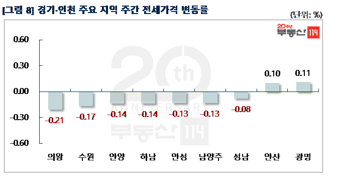 경기ㆍ인천은 ▼의왕(-0.21%) ▼수원(-0.17%) ▼안양(-0.14%) ▼하남(-0.14%) ▼안성(-0.13%) ▼남양주(-0.13%) 순으로 하락했다. 의왕은 장안지구, 백운밸리의 새 아파트 입주 여파로 거래 소강상태에 접어들었다. 내손동 의왕내손e편한세상, 포일자이 등은 전셋값이 500만원 떨어졌다. 수원은 망포동 영통아이파크캐슬1단지가 3월부터 입주하면서 인근 망포마을동수원LG빌리지Ⅱ, 망포마을현대아이파크2차가 1,000만원-2,000만원 내렸다. 반면 △광명(0.11%) △안산(0.10%)은 전셋값이 올랐다. 광명은 소형 위주로 수요가 이어지면서 하안동 e편한세상센트레빌이 1,000만원 상승했다.