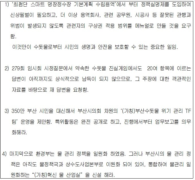 또한, 국내 설치된 막공정이 전국정수장, 하수처리장에 수 조원 규모의 불량시설물이 숨겨져 있다는 사실도 들어 났는데, 이중 현재 수영과 남부 하수처리장에 설치된 불량시설물도 전문가 및 시의회와 함께 공동조사를 추진하여 더 이상 시민혈세가 낭비되는 사례를 막아야 한다고 재차 강조했다.