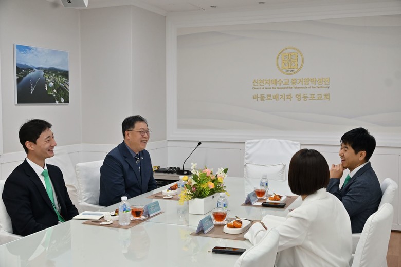 | ▲ 20일 영등포교회 대회의실에서 정노 헌혈개발팀장과 위아원 관계자들이 헌혈 캠페인 성과를 공유하며 차담을 나누고 있다. [사진 제공 = 청년자원봉사단 위아원 서울경기서부지부] |