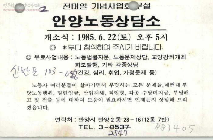 그 해 6월 22일 저는 전태일 기념사업회 부설 안양노동상담소를 자비로 설립했고, 초대소장으로 약 36일간 근무했어요. ‘안양지역 노동운동사’라는 책에는 당시 전태일 기념사업회 김문수 사무국장의 제안으로 안양노동상담소가 만들어졌다는 취지로 기록되어 있는데 전혀 그렇지 않아요. 저에게 진위도 확인하지 않고 이를 인용한 몇몇 책들이 있어 김문수 선배가 제안한 것은 명칭뿐이라는 것을 확실하게 밝히고 싶어요.