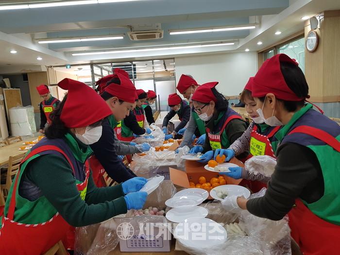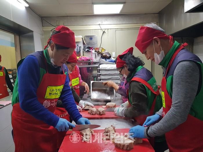 [세계타임즈 심귀영 기자]나누고 베풀고 봉사하는 그룹 한옥순 회장 1월 26일 10시에 성정민 (주) 벨라랩 대표염동주 힐링안과 대표원장 박성란 (사)단법인 한국중국어관광통역사협의회 회장 정마리아 나누고 베풀고 봉사하는 그룹부회장 후원으로 회원 20명은 설 맞아 서울시 구로구 가리봉동 이주민 지원 NGO단체인 지구촌 사랑 나눔 급식소에서 찾아 사랑과 정성이 듬뿍 담긴 삼겹살 떡 과일을 정성스레 준비해 국내 체류 이주민 및 다문화 외국 근로자 탈북민들을 대상으로 등 150명에게 설 맞아 서울시 구로구 가리봉동 이주민 지원 NGO단체인