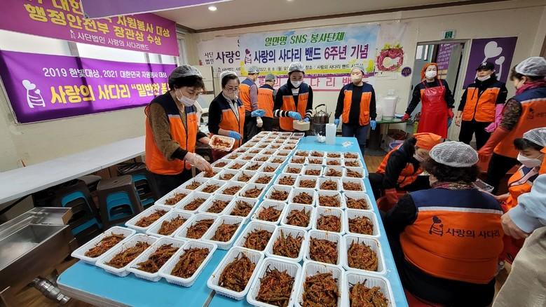 [대전 세계타임즈=이채봉 기자] 대전광역시 SNS 일만명 봉사단체 사랑의 사다리 밴드(리더 이정제)는 10일 오전9시~오후1시에 대덕구 중리동에 위치한 사랑의 사다리 밴드 사무실에서 밑반찬 3가지를 만들어서 동구 소외계층 60가정에 전달을 하였다.