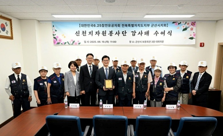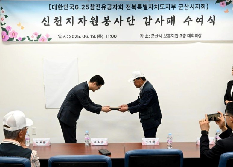 이날 6.25참전유공자회 군산시지회와 신천지자원봉사단 전북연합회 관계자들이 참가한 가운데 군산 보훈회관에서 감사패 수여식이 진행됐다.