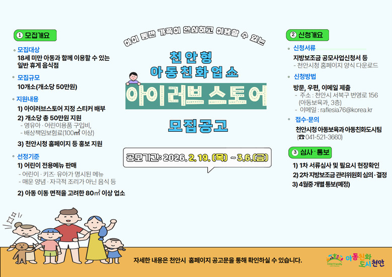 석재옥 아동보육과장은 “아이러브스토어 운영을 통해 아동의 작은 목소리에도 귀 기울이는 도시, 아동이 환영받는 지역사회를 만들어 나가겠다”며 “아이 키우기 좋은 천안을 위해 지역 영업자들의 많은 관심과 참여를 바란다”고 말했다.