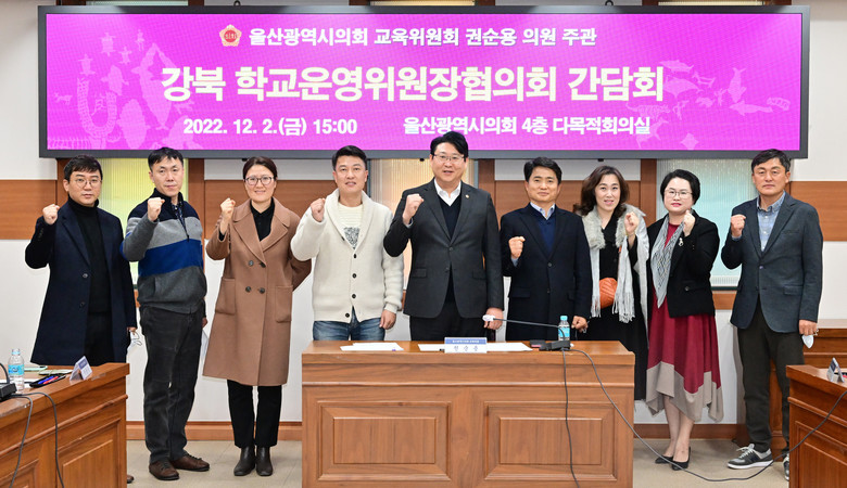 [울산 세계타임즈=이호근 기자] 울산광역시의회 권순용 의원(교육위원회)은 2일 오후 3시, 강북 학교운영위원장협의회 임원 8명과 함께 간담회를 개최하고, 학교 급식단가 인상, 조리사 파업 시 대체식 지급 및 학교운영위원장협의원 지원 등에 대해 의견을 청취했다.