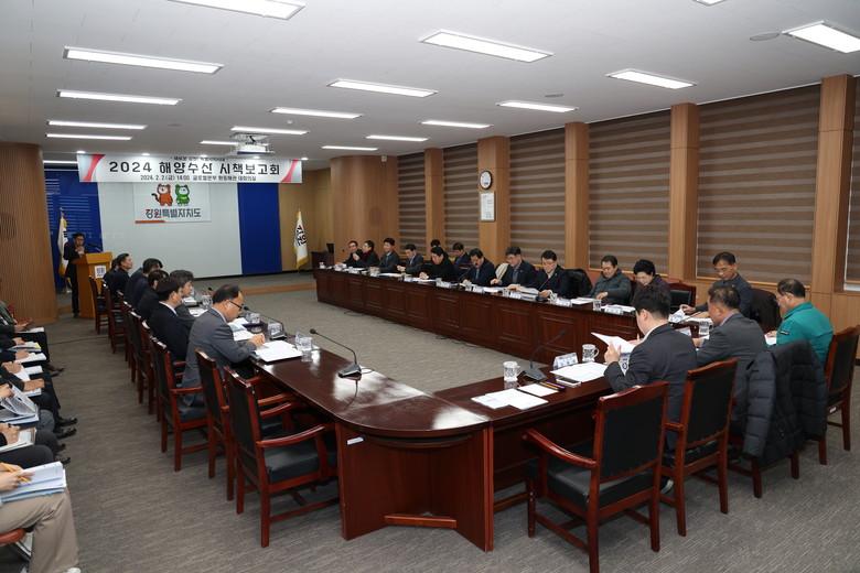 이어서, 권혁열 의장은 이날 시책보고회에서 “기후 온난화와 수산자원 고갈로 어업인 수입이 감소하며 청년인구 유출로 어촌지역 인구소멸이 가시화되고 있다.”고 밝히고 “2024년 해양‧수산분야 주요 시책의 면밀한 추진뿐만 아니라 동해안권 핵심 현안 해결을 위한 법적근거 마련을 위해 필수적인 ‘해양이용 협의권 이양’, ‘어촌어항 항만관리’, ‘강원 항만공사 설립’ 등 「강원특별법」 2차 개정안에 포함되지 못한 내용들이 3차 개정안에 반영될 수 있도록 해양수산국의 적극 행정을 당부드린다.”고 말하며 이날 시책보고회를 마쳤다.