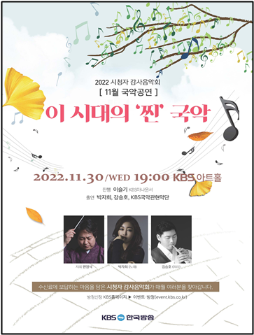 KBS는 “11월 마지막 국악 감사음악회에서 한 해를 마무리하며 음악으로 따뜻한 위로를 받고 2023년 새 희망의 기운까지 받아가시길 바란다”고 전했다