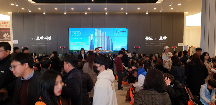‘호반써밋 송도’ 견본주택에는 오픈 첫날부터 방문객들의 발길이 이어졌는데, 이른 아침부터 하루 종일 수 백여 미터의 대기줄이 이어졌다. 견본주택 내부에도 유니트를 관람하려는 사람들로 북새통을 이루었고, 상담석도 마감시간까지 상담이 이어졌다.