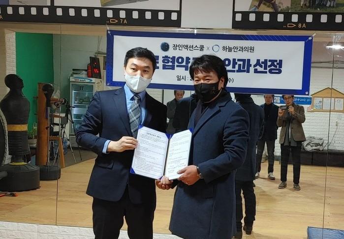 | ▲우측부터 장인 액션스쿨(대표, 무술감독 손용화), 하늘 안과의원(대표원장 이창건) |