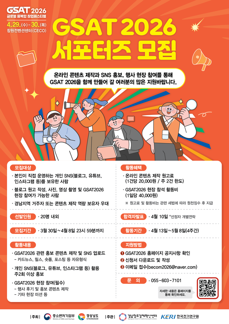 강두순 경남도 창업지원과장은 “GSAT 2026의 생생한 현장과 혁신적인 창업 에너지를 알리는 서포터즈의 역할이 중요하다”라며, “참신한 시각과 디지털 역량을 갖춘 서포터즈들의 많은 관심과 참여를 바란다”고 말했다.