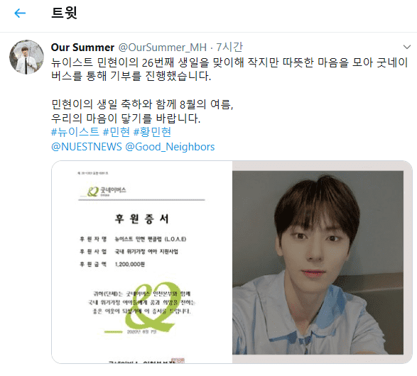민현 팬클럽 ‘L.O.Λ.E(러브)’는 “가수 ‘민현’의 생일을 맞아 의미 있는 기부를 하고 싶었는데 굿네이버스 ‘소녀야 너는 반짝이는 별’캠페인을 통해 지나온 청소년기를 떠올리게 됐다”며, “불편하고 힘든 상황에 처했을 위기가정 여아들을 응원하는 마음으로 기부했다”고 말했다.