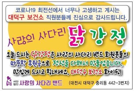대덕구보건소 라미경 감염병관리팀장은 ”오늘 사랑의 사다리 밴드 봉사단체에서 닭강정을 지원해주어서 큰 힘과 위안이 된다.“면서 ”코로나 19가 하루속히 종식될 수 있도록 대덕구 보건소는 최선의 노력을 다하겠다.“고 말했다.