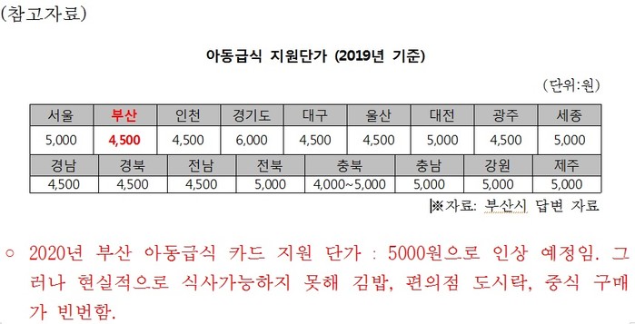 이에 그는 “적정 수준의 물가상승률을 반영해 결식아동들의 건강권을 보장해야 한다”고 덧붙이며, 부산시와 교육청 그리고 기초지자체와 협의체를 조속히 구성하여 결식우려아동 급식 지원단가를 현실화할 것을 촉구했다. 이와 함께 아동급식전자카드 사용 편의성 증진 및 결식아동을 위한 어린이식당 운영을 요구했다.