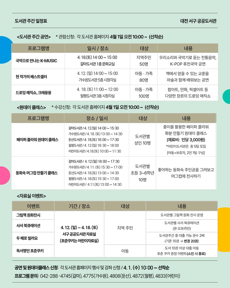 이번 프로그램은 도서관의 날(4월 12일)과 도서관 주간(4월 12~18일)을 맞아 기획됐다. 기간 동안 기념 공연으로 △갈마도서관 ‘국악으로 만나는 K-MUSIC’ △가수원도서관 ‘현 작가의 베스트셀러(독서 권장 마술쇼)’ △월평도서관 ‘드로잉 매직쇼: 크레용용’ 등이 열린다.