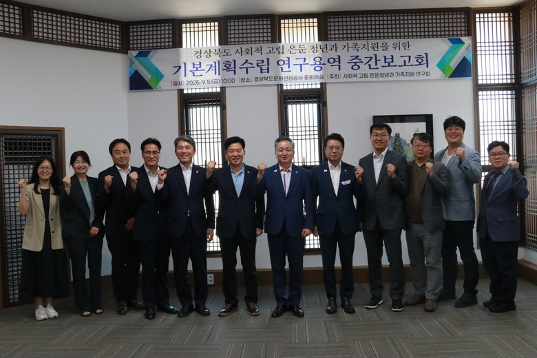 [경북 세계타임즈=한윤석 기자] 경북도의회 「사회적 고립・은둔 청년과 가족 지원 연구회」(대표 이동업 의원)는 5일(금) 10시 경상북도문화관광공사 회의실에서 ‘경상북도 사회적 고립・은둔 청년과 가족 지원을 위한 기본 계획 수립 연구용역’ 중간보고회를 개최했다.