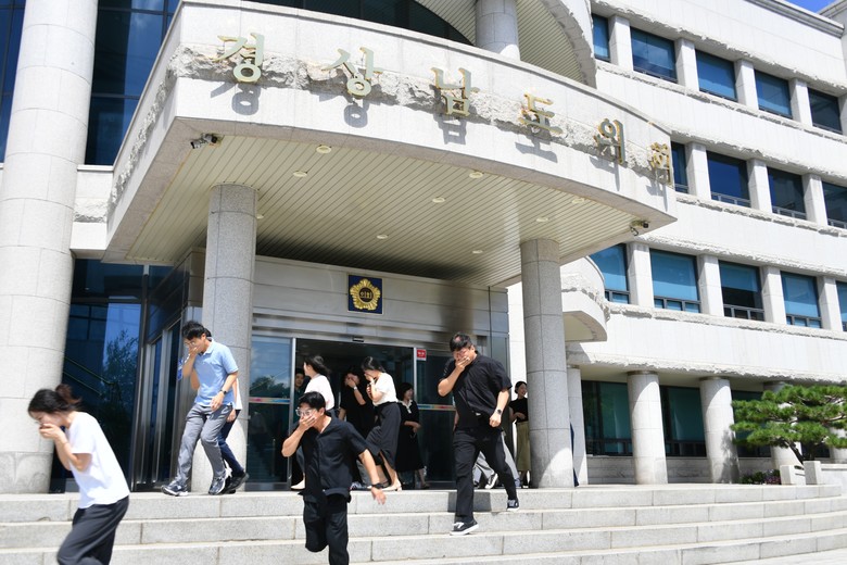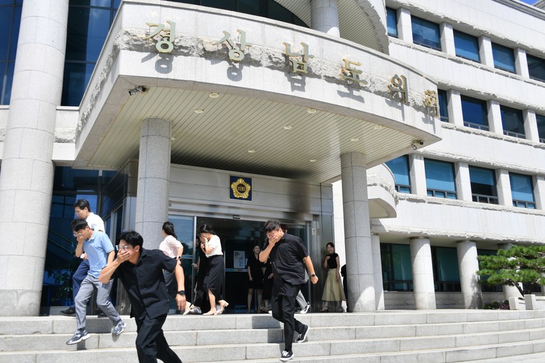 [경남 세계타임즈=최성룡 기자] 경상남도의회(의장 최학범)는 20일 14시부터 20분간 의회 본관 및 의원회관 등에서 20분간 공습대비 민방위 훈련을 실시했다.