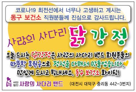 강은정 사무국장은 “코로나19로 힘든 상황에서 장애인분들이 닭강정을 맛있게 드시고 힘을 내셨으면 좋겠다.”고 말했다.