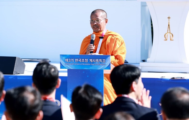 ▲ 지난 1일 경기 청평 신천지 평화연수원에서 신천지예수교 증거장막성전 주최로 열린 ‘제3기 만국초청 계시록 특강 종강식’에서 속 분트은(국립불교 교육총감찰부 불교고등교육부) 국장이 사례를 발표하고 있다 [사진 제공 = 신천지예수교 증거장막성전]