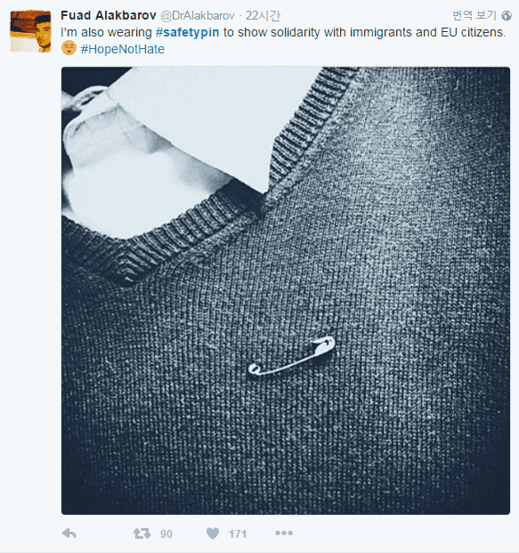 앨리슨이라는 아이디로만 알려진 트위터리안이 제안한 일명 '안전핀(safety pin)운동'은 지난 주말부터 소셜네트워크서비스(SNS)를 통해 급격히 전파되고 있다. 수많은 사람들이 '#safetypin'이라는 해시태그와 함께 옷핀을 착용한 사진을 SNS에 게시하고 있다.