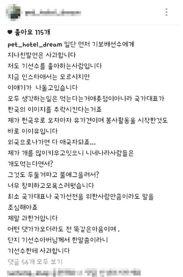 이를 뒤늦게 파악한 정씨는 앞선 기 선수에 대한 욕설글 다음으로 사과글을 올리며 "기 선수 아버님께서 한 말씀이니 기선수한테 사과합니다"고 밝힌 뒤 자신의 계정을 비공개로 전환시켰다.