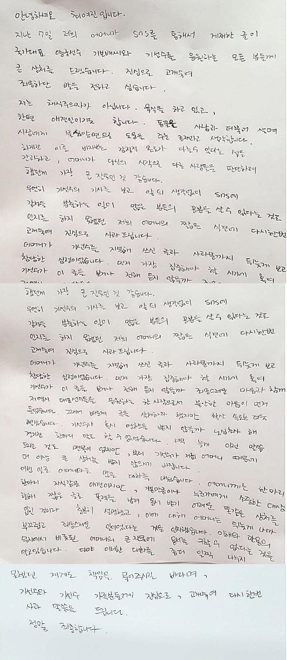 한자 한자 눌러쓴 자필 사과문을 통해 최여진은 거듭 사죄의 뜻을 밝히며 모친의 잘못과 이를 막지 못한 자신의 실수를 인정하는 모습을 보였다.